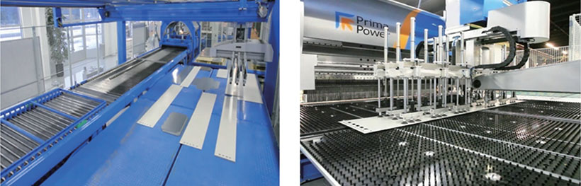 鈑金沖剪折柔性加工中心采用同類設備中世界知名品牌意大利Prima Power 公司鈑金智能加工生產線,該生產線由智能立體料庫系統、SGe6 沖剪復合機系統,PSR分類及迭層系統,BTD折彎部件翻轉定位裝置和EBe5 自動折彎中心組成。SGe6沖剪中心集自動上料、沖剪及剪切于一體;采用20工位伺服轉塔沖床及直角剪進行組合,采用多子模具進行模具存儲,最大存儲模具量達320套。